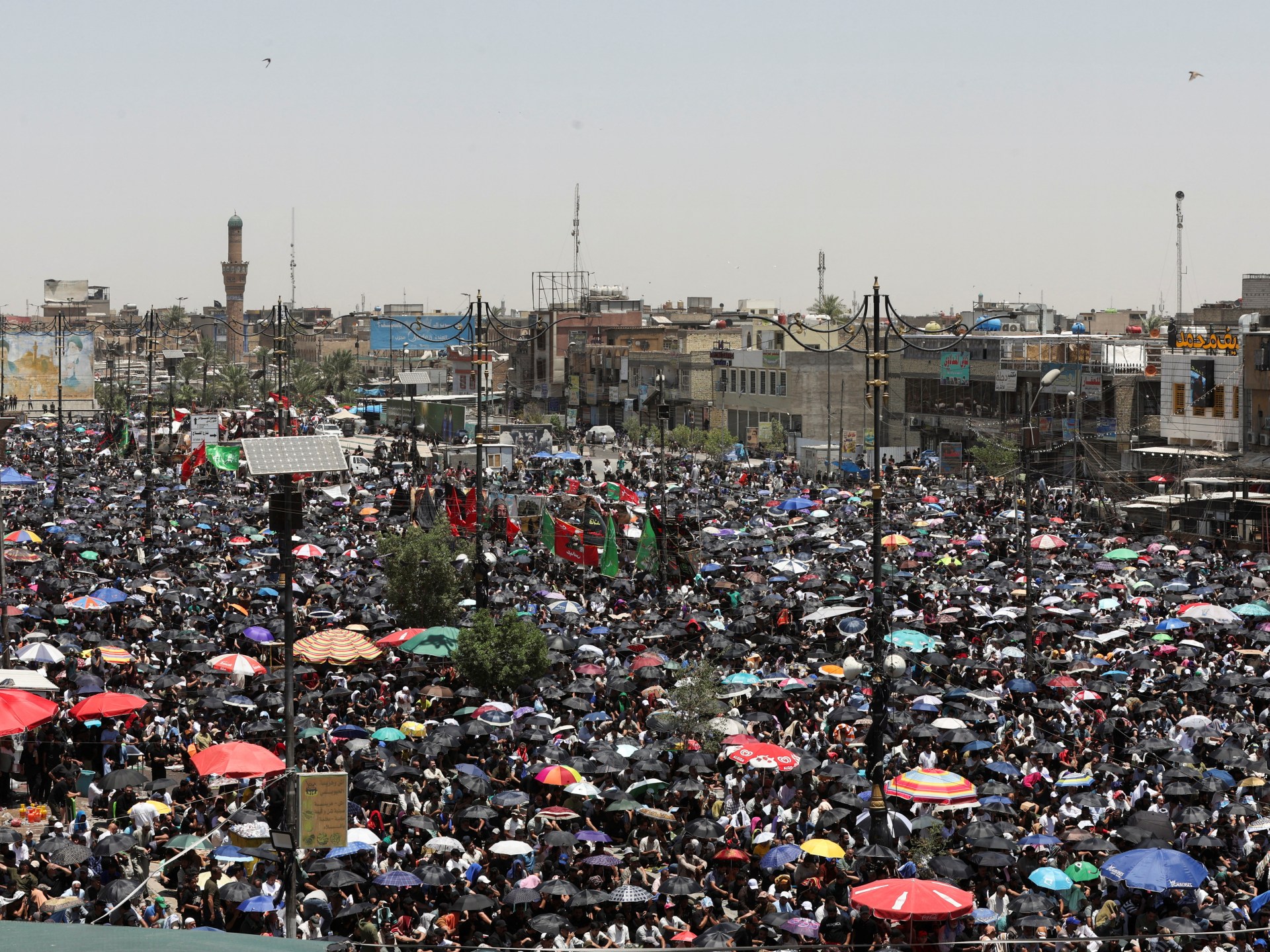 وفي مدينة الصدر بشرق بغداد، أدى متظاهرون أولا صلاة الجمعة ثم هتف الخطيب الشيخ خضير الأنصاري “كلّا كلّا أميركا، كلّا كلّا إسرائيل”، في حين ردّد الحاضرون الشعار حاملين مظلّات للاحتماء من أشعة الشمس الحارقة.