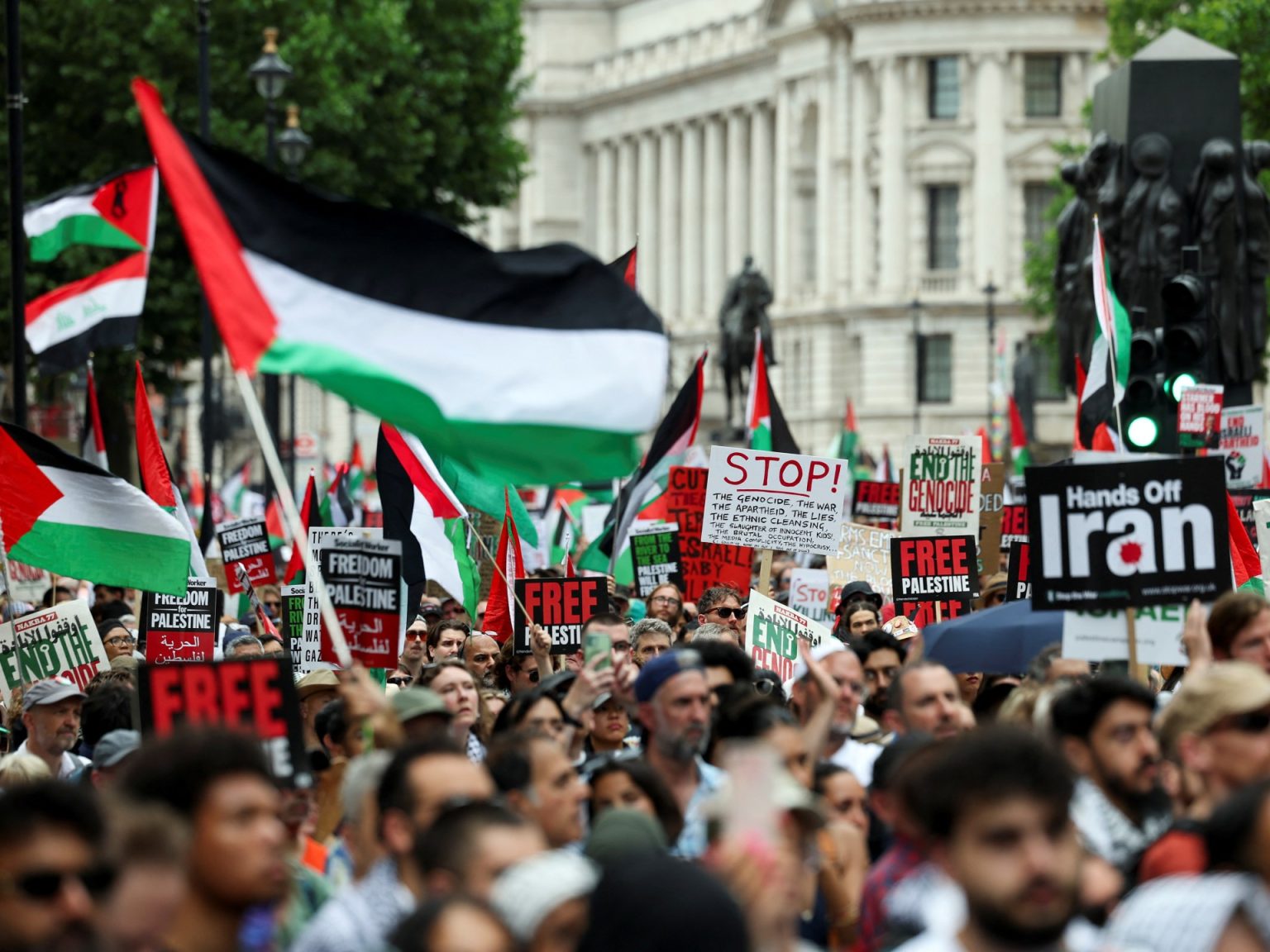 فقد رفع عشرات آلاف المتظاهرين في لندن أعلام فلسطين ولافتات تطالب بوقف الإبادة الجماعية في غزة، ورفعوا أيضا لافتات تطالب بوقف الحرب الإسرائيلية على إيران.