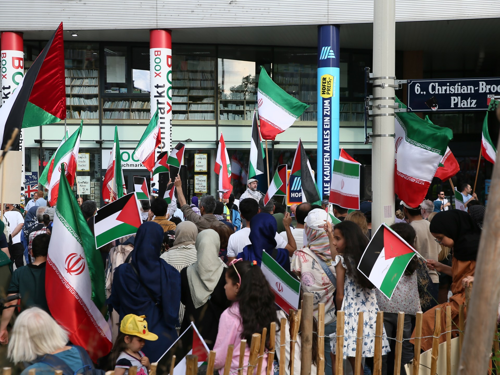 وتجمّع المتظاهرون في شارع ماريا هيلفر ستراسه بفيينا تحت شعار “ضعوا حدا لعدوان إسرائيل”، ورفعوا أعلام فلسطين وإيران.