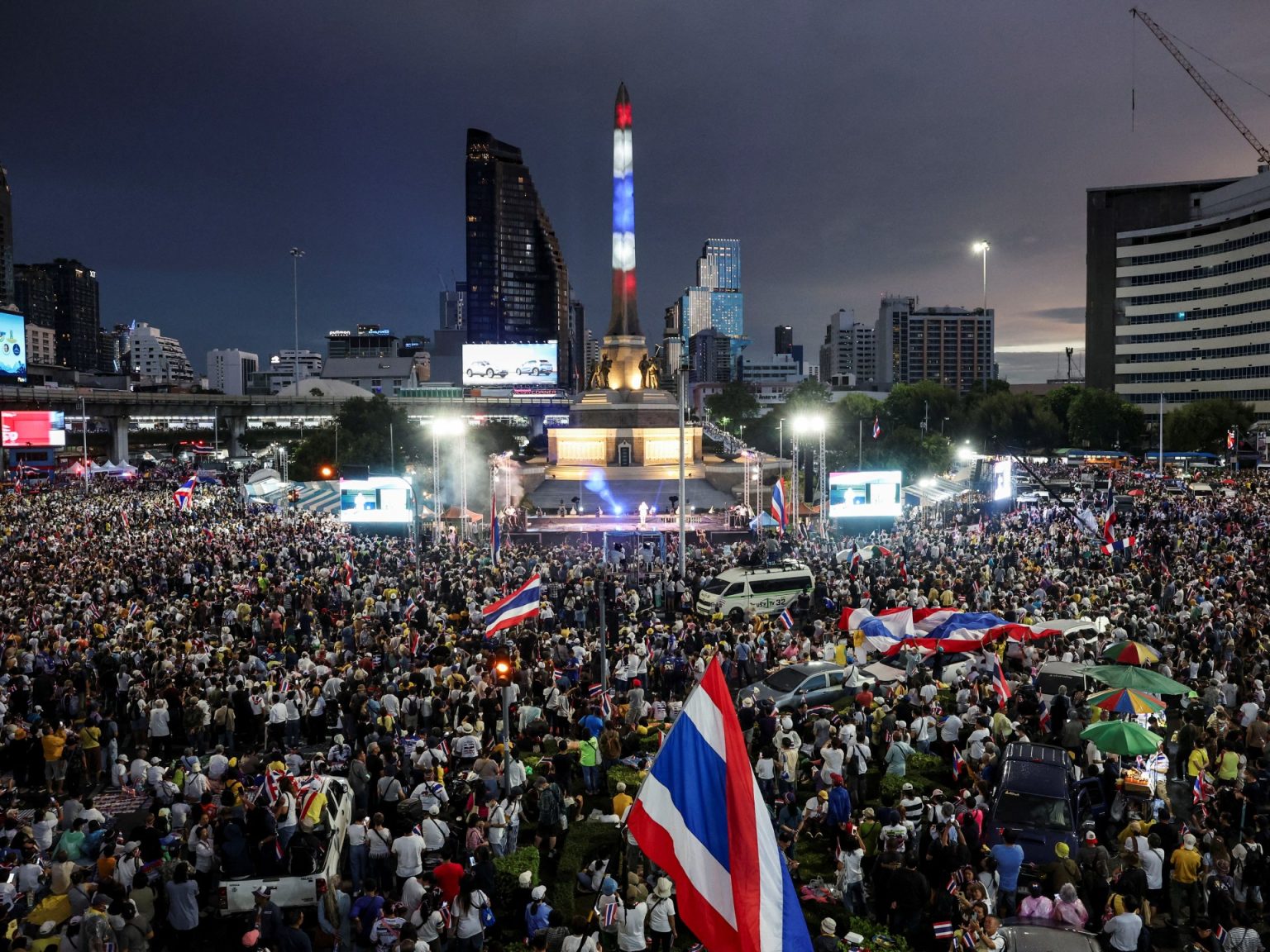 واحتشد نحو 4 آلاف متظاهر في الشوارع المحيطة بنصب النصر التذكاري في العاصمة، ملوحين بأعلام تايلندية ومطلقين هتافات وهم يستمعون إلى خطابات تتداخل مع موسيقى حية.