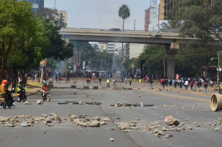 فوضى عارمة شهدتها طرق العاصمة نيروبي بسبب الاحتجاجات (الجزيرة)