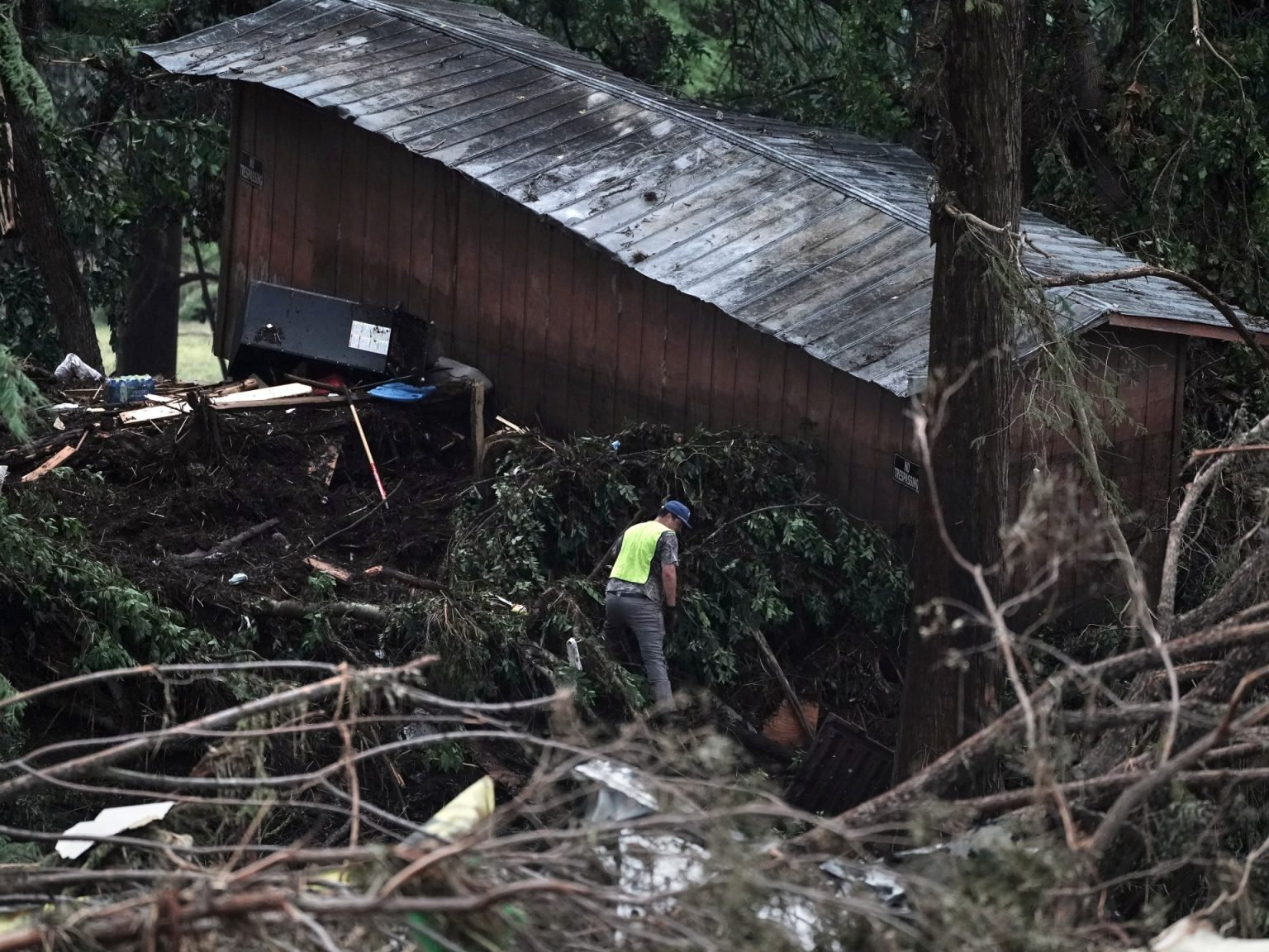 وبينما شاهدت العائلات الدمار لأول مرة، قامت فرق العمل القريبة التي تعمل على المعدات الثقيلة بسحب جذوع الأشجار والأغصان المتشابكة من الماء أثناء بحثها في النهر.
