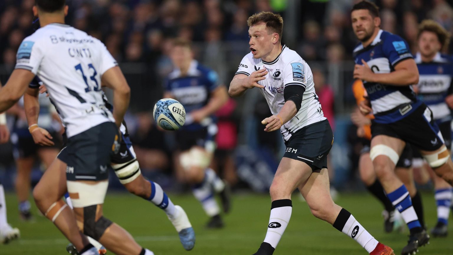 78 – ضربة جزاء! حمام الرجبي 12 SARACENS 13 (فاريل) – يتراكم المسلمون على عدادات الضغط من خط المحاولة قبل أن يأتي دو بليسيس من موقع تسلل ليحتسب ركلة جزاء. يركل فاريل المشاركات ويقتل بعض الوقت قبل أن يصل إلى 12-15.
