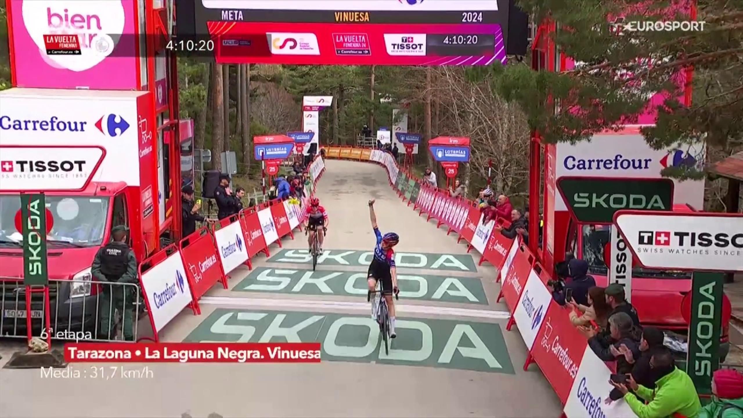 “شهدت المعركة الرائعة في الصعود الأخير للمرحلة السادسة من La Vuelta Femenina مواكبة إيفيتا موزيتش لديمي فوليرينج قبل هجوم متأخر لتحقق فوزًا رائعًا لفريق FDJ-Suez. أكملت يارا كاستيلين منصة التتويج في المركز الثالث. ويظل فوليرينج في صدارة السباق بعد أن خصص المزيد من الوقت لمنافسيها. قم ببث أفضل أحداث ركوب الدراجات على Eurosport وdiscovery+.”