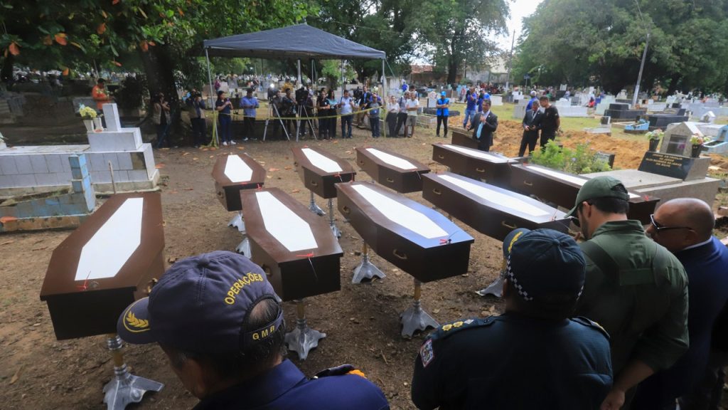 تم دفن جثث تسعة مهاجرين عثر عليهم على متن قارب أفريقي قبالة الساحل الشمالي لمنطقة الأمازون البرازيلية، الخميس، في مراسم مهيبة في بيليم عاصمة ولاية بارا.