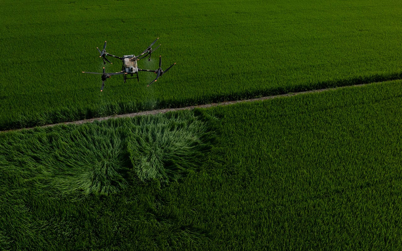هذا بالإضافة إلى الطائرة بدون طيار العملاقة، التي يشبه جناحيها جناح النسر، وتحلق عالياً في الأعلى بينما تمطر الأسمدة العضوية على شتلات الأرز التي يصل ارتفاعها إلى الركبة والتي تتصاعد في الأسفل.