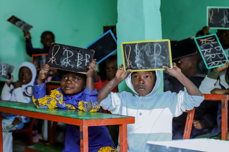 يجلس الأولاد في فصل دراسي في منظمة Nouadhibou لدعم المهاجرين واللاجئين (ملف: Khaled Moulay/AP)